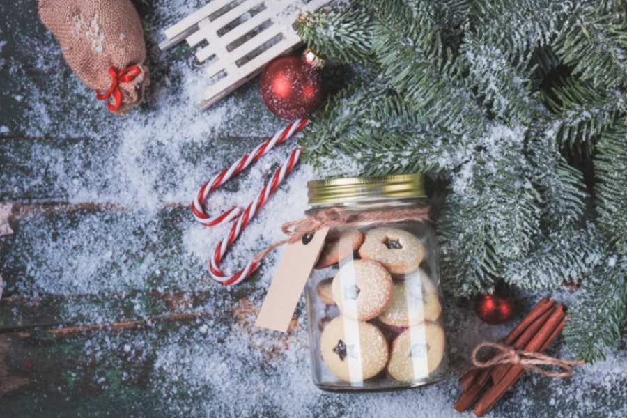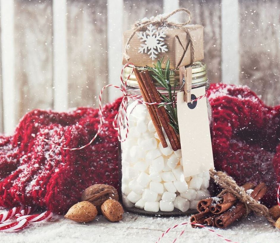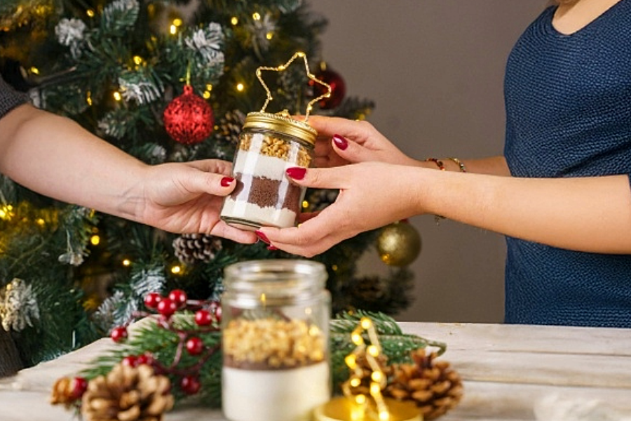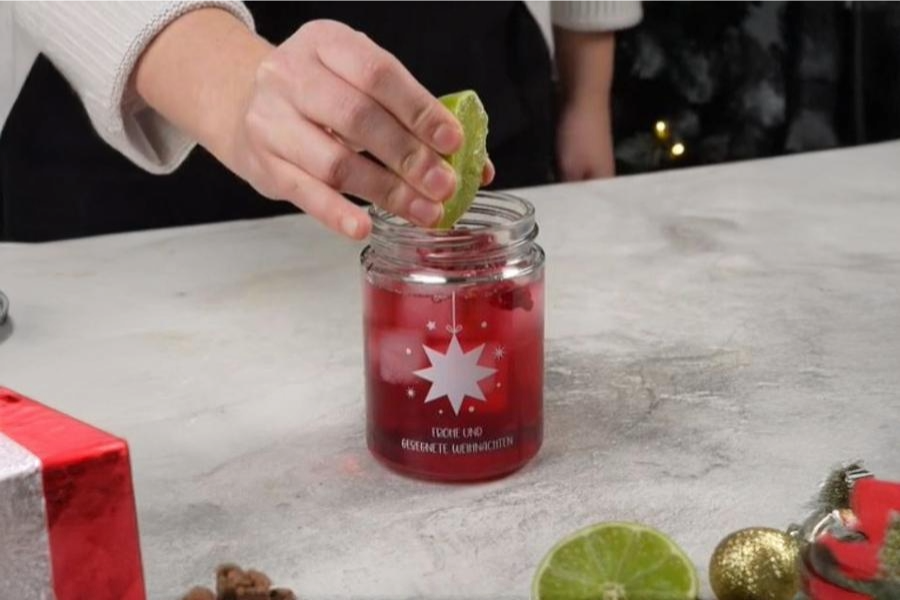 - In dekoratives Glas füllen und mit Stoff oder Band verschließen.