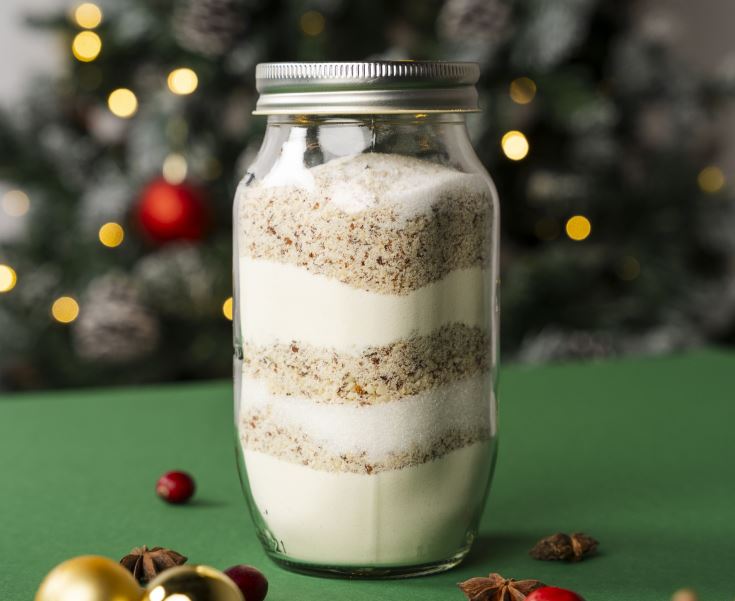 - Kakaopulver ins Glas füllen, Zucker und Gewürze schichten.