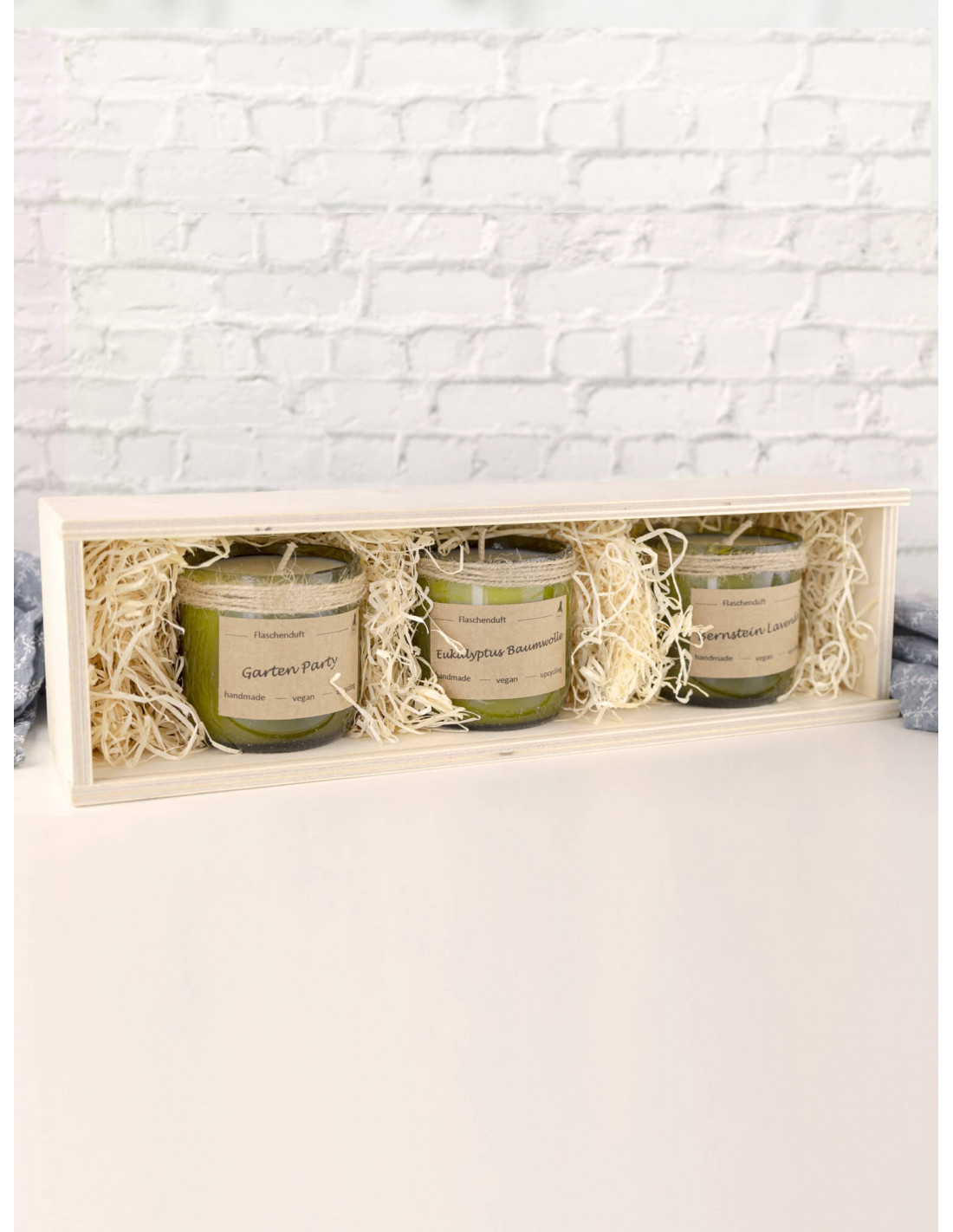 Gebrauchten Flaschen wird neues Leben eingehaucht, gefüllt mit Sojawachs und herrlichen Duftaromen. Wohltuend, erfrischend, im Einklang mit der Natur. Verpackt in 3er Holz-Geschenkbox.